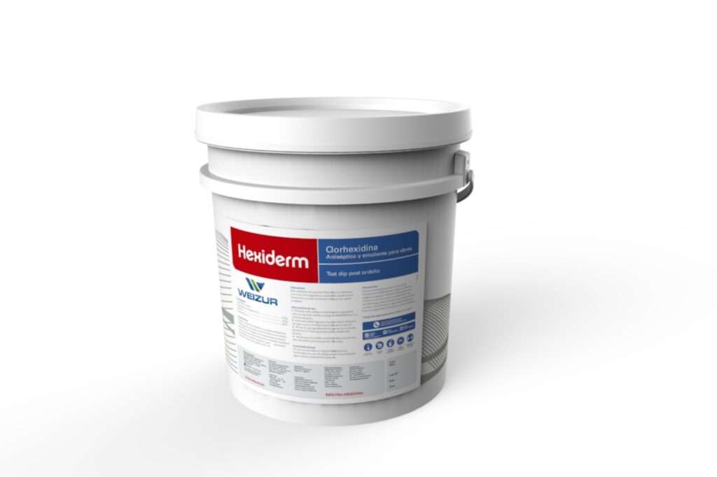 1 – Al final de cada ordeñe, inmediantamente después de retirar la unidad de ordeñe, sumergir en HEXIDERM los 3 cm inferiores del pezón.